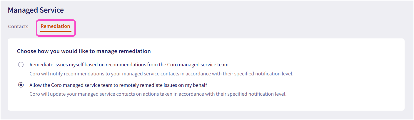 Allow the Coro managed service team to remotely remediate issues on my behalf: Allow the Coro managed service team to remediate issues remotely. Coro updates your managed service contacts in accordance with the notification level specified when creating a managed service contact.