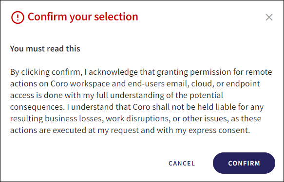 Review the consent conditions and select CONFIRM to authorize the Coro managed service team to perform remote actions on your Coro workspace.