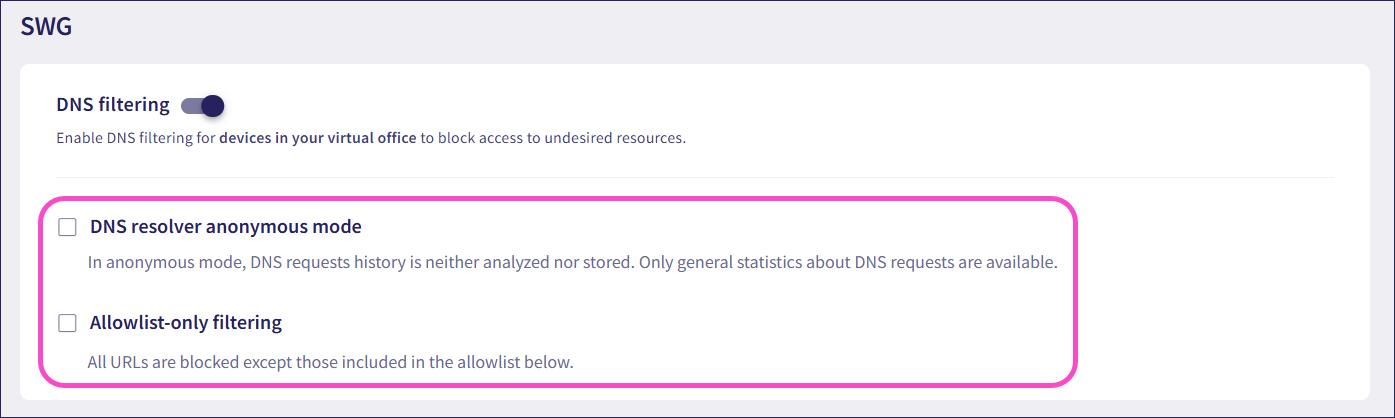 - DNS resolver anonymous mode: Protects user privacy by not tracking individual data. This option ensures that Coro does not analyze or store the DNS request history.