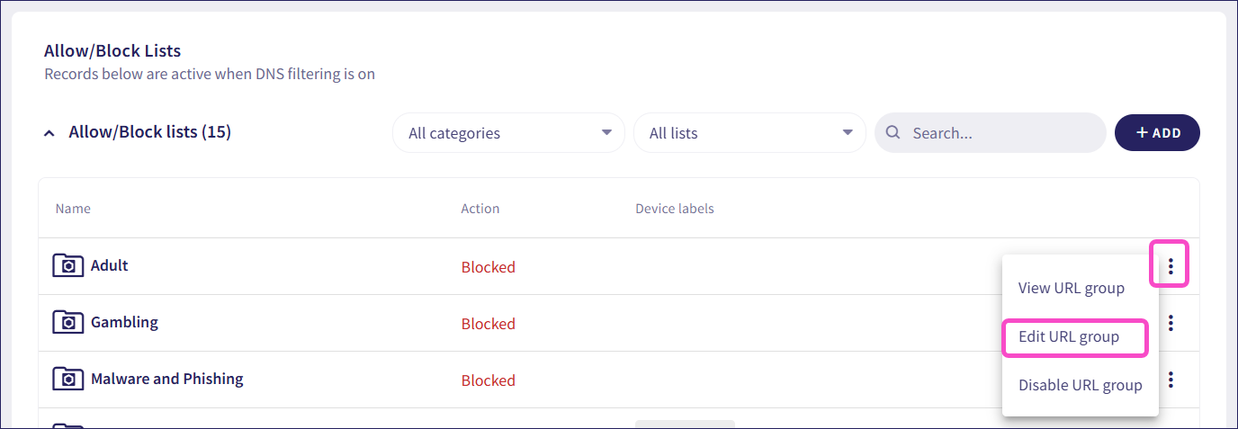 From the three-dot menu of the relevant URL group, select Edit URL group: