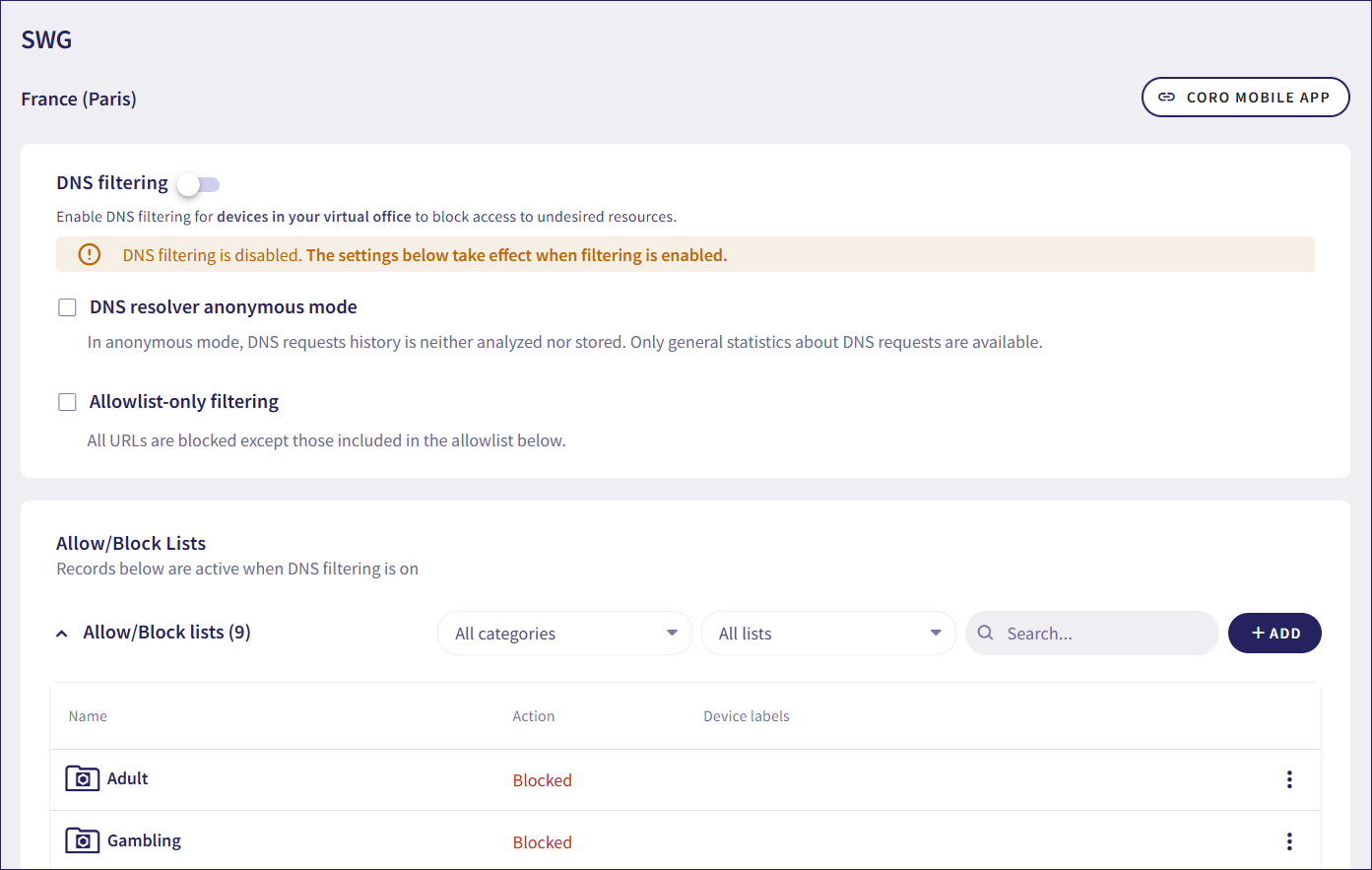 Admin users can make changes to the DNS filtering section whether filtering is enabled or disabled. If you make changes while DNS filtering is disabled, Coro applies those changes after you enable filtering.
